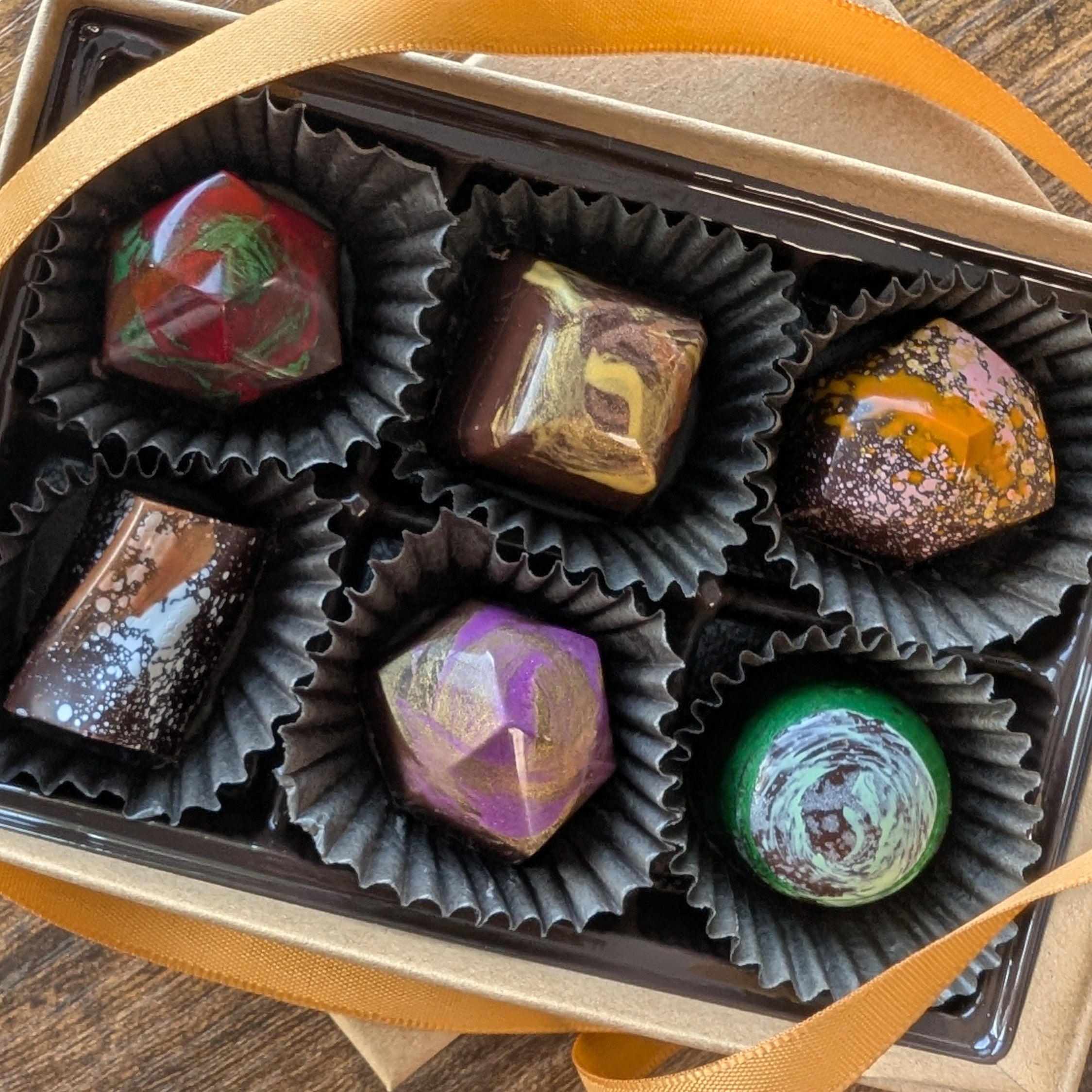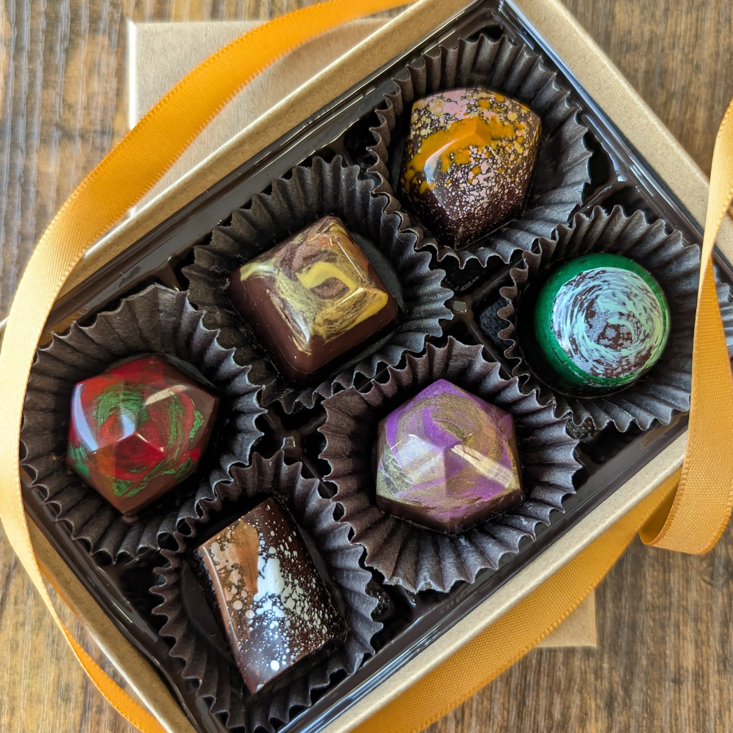 Our dairy free dark chocolate truffles are sure to impress even the most discerning vegan! Each piece is made without animal products, and our dark chocolate is fair trade and organic. Each box includes 6 unique and tantalizing flavors!