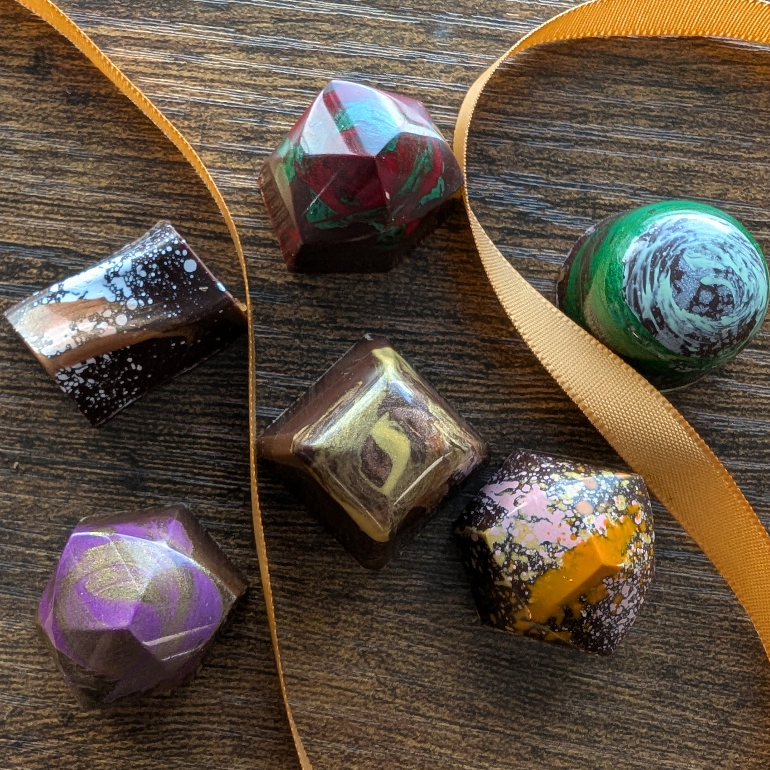 Our Cranberry Maple Caramel showcases fresh cranberries and rich maple syrup in a coconut caramel with a dark chocolate shell. The Snickerdoodle bon bon features a spiced gluten free oat milk and dark chocolate ganache- this is our first dairy free piece without coconut milk! The Lime Daiquiri bon bon combines spiced rum and fresh lime in a coconut dark chocolate ganache. The Mayan Chocolate bon bon is a dairy free take on our award winning Mexican Chocolate truffle- featuring a blend of 10 different spices, dark chocolate and coconut. Our Ohana bon bon is our take on the Hawaiian POG juice- it has a blend of passion fruit, orange and guava with coconut and dark chocolate. Lastly, the seasonal chai coconut caramel features Teatulia chai with a rich vanilla coconut caramel in a crisp dark chocolate shell.