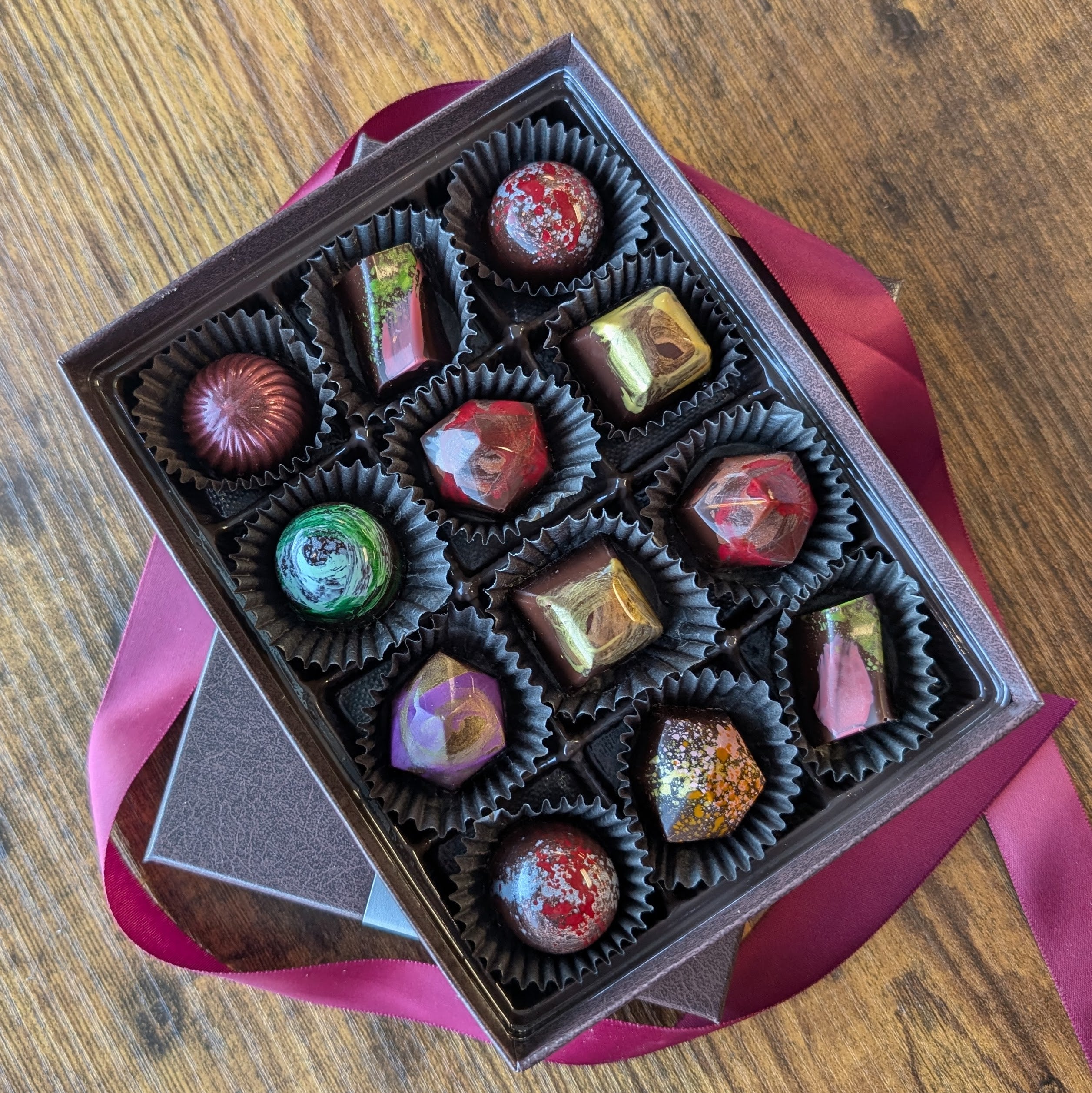 Our Cranberry Maple Caramel showcases fresh cranberries and rich maple syrup in a coconut caramel with a dark chocolate shell. The Snickerdoodle bon bon features a spiced gluten free oat milk and dark chocolate ganache- this is our first dairy free piece without coconut milk! Our classic Cherry Cordial contains an Italian candied cherry wrapped in a liquid cognac fondant. The Lime Daiquiri bon bon combines spiced rum and fresh lime in a coconut dark chocolate ganache. The Mayan Chocolate bon bon is a dairy free take on our award winning Mexican Chocolate truffle- featuring a blend of 10 different spices, dark chocolate and coconut. Our Caramelized Raspberry bon bon showcases fresh raspberries caramelized with lemon and dark chocolate. Our Ohana bon bon is our take on the Hawaiian POG juice- it has a blend of passion fruit, orange and guava with coconut and dark chocolate. Lastly, the seasonal grapefruit cardamom caramel features a fresh grapefruit and floral cardamom coconut caramel in a crisp dark chocolate shell.