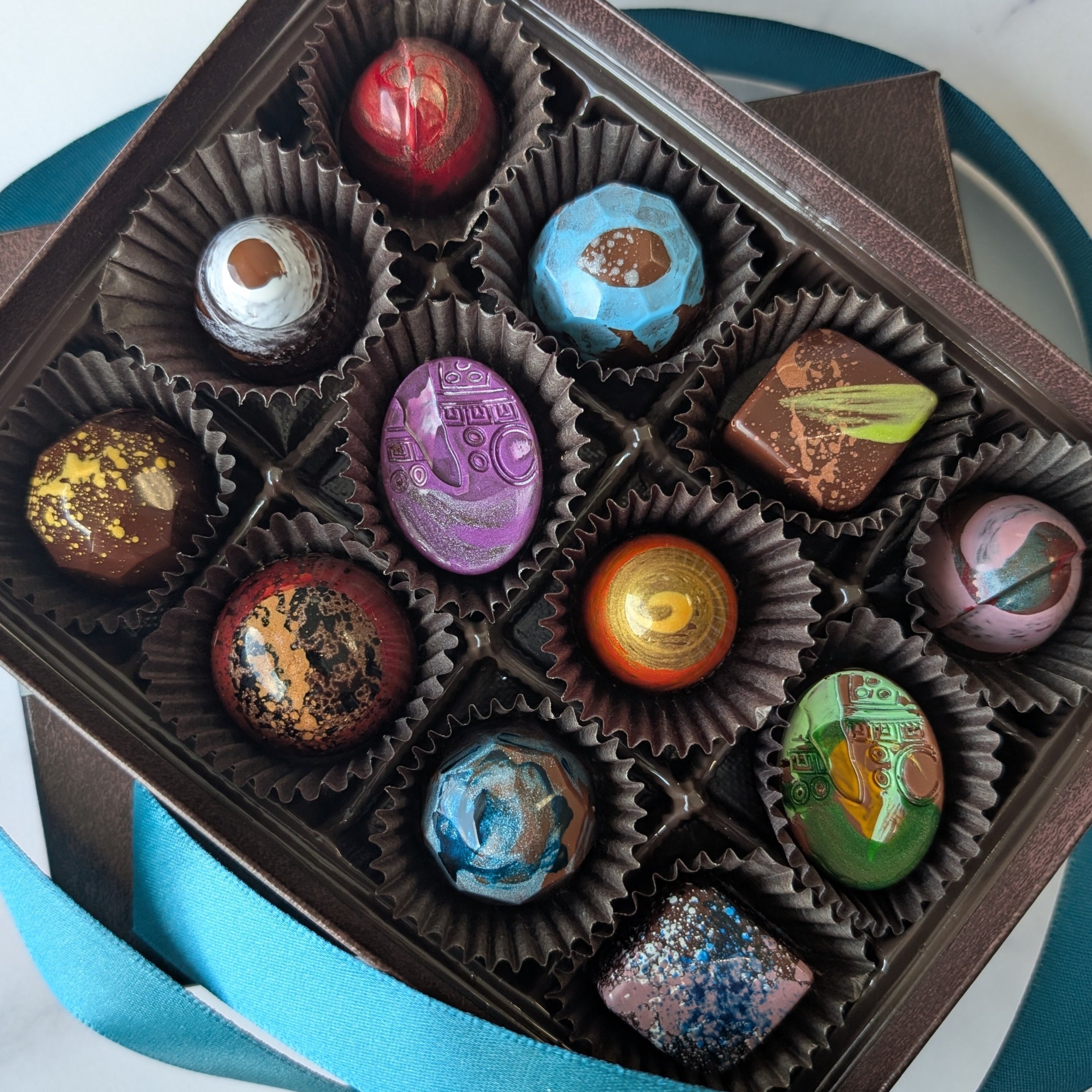 Our signature truffle gift box features 12 unique flavors that are signature to m2 Confections. Each truffle is individually hand painted, and showcases bold and distinct flavors. Each box includes the following flavors:
